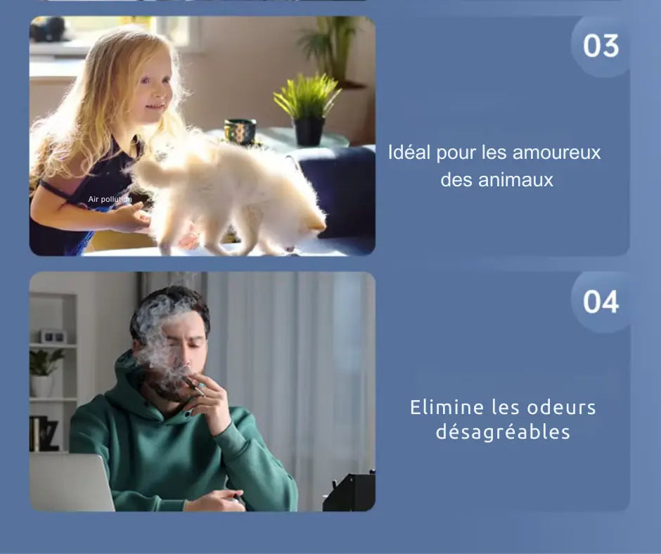 - Purification avancée et efficace : Grâce à sa filtration HEPA multi-étapes et à la diffusion continue d’ions négatifs, Hellomiva AirPure capture les particules fines, réduit le formaldéhyde, les odeurs d’animaux, la fumée et les polluants domestiques, pour un air plus pur et plus frais, jusqu’à 30 m².
